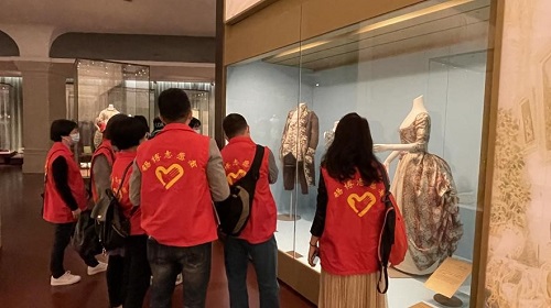座谈会结束后,中国丝绸博物馆的讲解员重点向大家介绍了“锦程——中国丝绸与丝绸之路”展览,为锡博志愿者们讲述了中国丝绸走过的五千年光辉历程,以及中国丝绸对东西方文明互鉴做出的卓越贡献。在西方时装馆中,展示的是四百年来的西方时装,这里不仅有繁复奢华的欧洲宫廷服饰,还有近现代以来美国、日本的时装。精致的蕾丝与缎带架构出独属于西方的浪漫主义情怀,志愿者们沉浸其中,感受它们穿越百年的美丽。