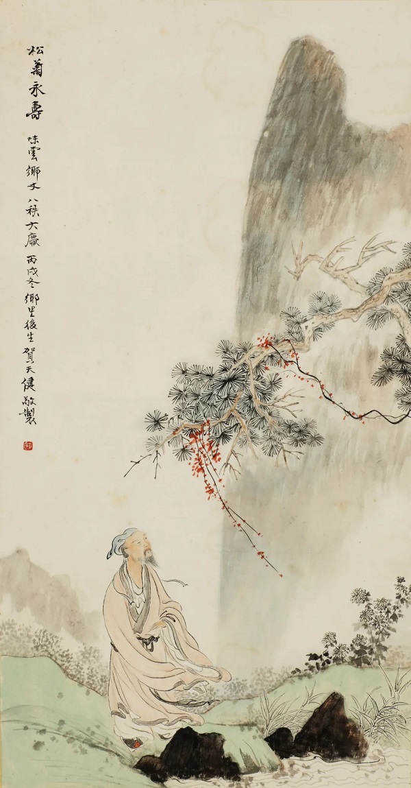 在本次展览的作品中,我还看到了“无锡人”与“无锡人”的交往之密,如吴观岱所作《重修贯华阁图轴》,是其画杨氏之贯华阁;贺天健的《松菊永寿图轴》,是为杨味云八十大寿所作。