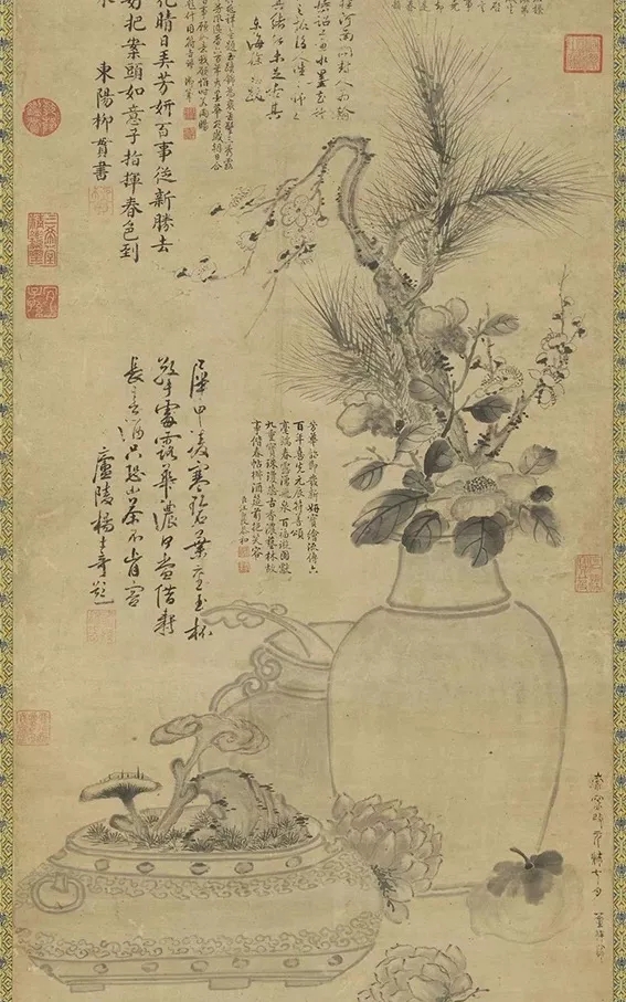 和其他生活雅趣一样,文人的审美决定了宋朝花艺的品味。宋代插花讲究线条之灵动、构图之疏朗、整体之气氛。在北宋董祥绘制的《初韶萃庆图》中,两三种花卉植物插制的三主枝造型插花已经出现。最长的花枝为第一枝,次长的花枝为第二枝,最短的花枝为第三枝。三主枝高低不一,分别作用于上段、下段和中段,然后加上装饰的枝梢,达到造型上的立体化。这种插花形制不仅影响了宋以后的插花艺术,也影响了日本等周边国家。