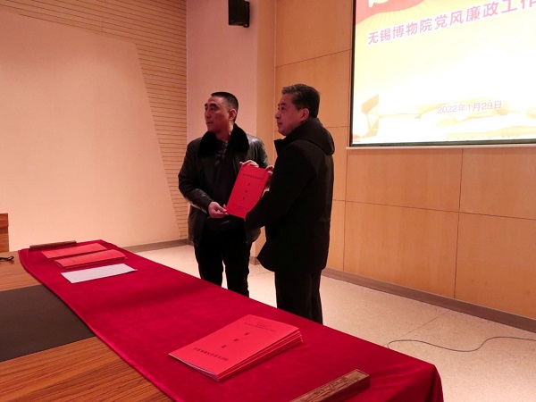 会上签订了《无锡博物院党风廉政建设责任书》和《无锡博物院安全责任书》,各部门主任及支部书记领取了责任书,随后肖炜书记带领学习十九届中央纪委六次全会主要精神,共同观看党风廉政教育片《永远在路上》。