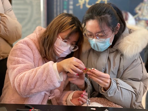 美是美,但也要出“虎”劲儿,活动现场准备了齐全的制作工具和材料。在社教老师的指导下按照步骤精心搭配花片与珠玉,这些零碎的材料在学员们的手中被巧妙地缠绕与组合。青丝渐绾,瑶簪流年。谁不喜欢东方古典诗意的美,戴上别致的发簪,成为新春里最独特的“美好”。
