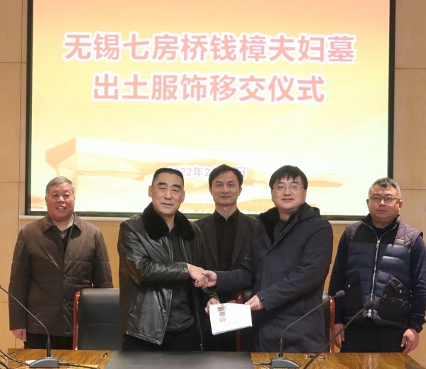 近日,无锡七房桥明代钱樟夫妇墓出土服饰移交仪式在无锡博物院举行,无锡市文物保护中心向无锡博物院移交无锡七房桥明代钱樟夫妇墓出土服饰 24件(套)。无锡市文化广电和旅游局副局长张曙峰,无锡博物院党总支书记、院长肖炜,无锡市文物保护中心主任刘宝山等领导出席了交接仪式。