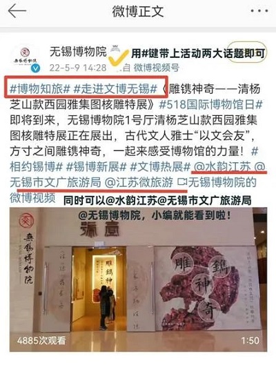 2022年“5•18国际博物馆日”的主题是“博物馆的力量”。江苏省文化和旅游厅在新浪微博发布#博物知旅#话题,面向公众围绕“博物馆的力量”开展话题讨论,同时无锡博物院也开启了#走进文博无锡#的话题,吸引公众参与。