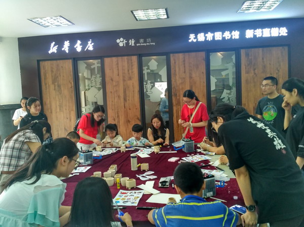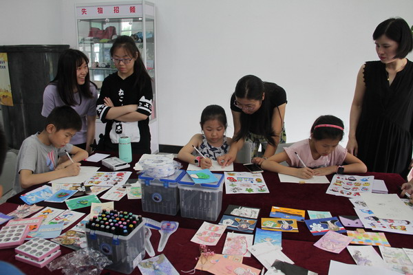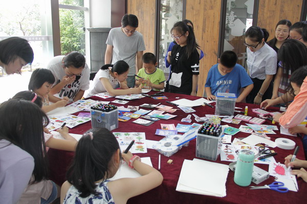 在6月16日上午推出的卡通立体明信片DIY活动中,孩子们在无锡城市职业技术学院师范学院老师们的引导和启发下展开奇思妙想,在特制的空白模板明信片上进行卡通形象的立体制作,通过版面设计、绘制、剪贴、装饰等步骤,尽情发挥创意思维和创作潜能。阳光沙滩、海底世界、爱心蒲公英、汽车总动员……一张张天真烂漫、趣味盎然的卡通立体明信片在一双双巧手中诞生了,孩子们的喜悦之情溢于言表。