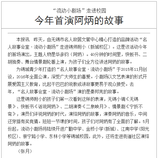 “流动小剧场”走进校园 今年首演阿炳的故事