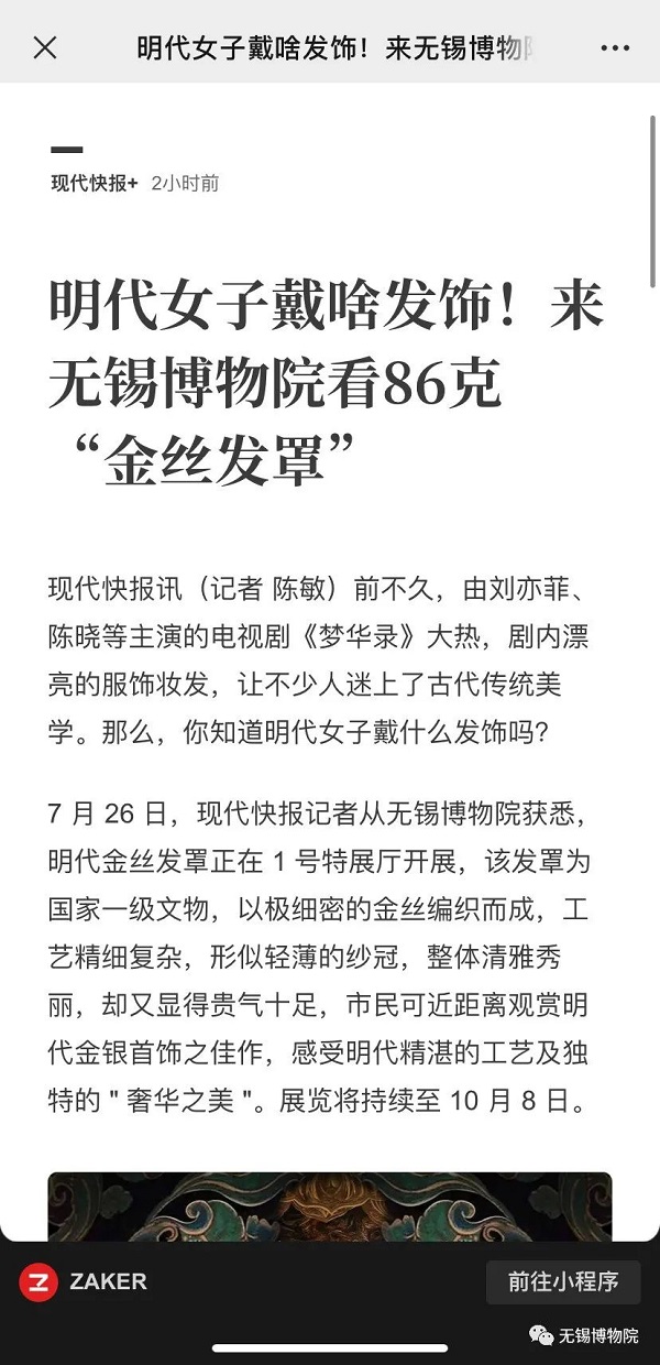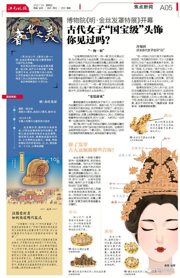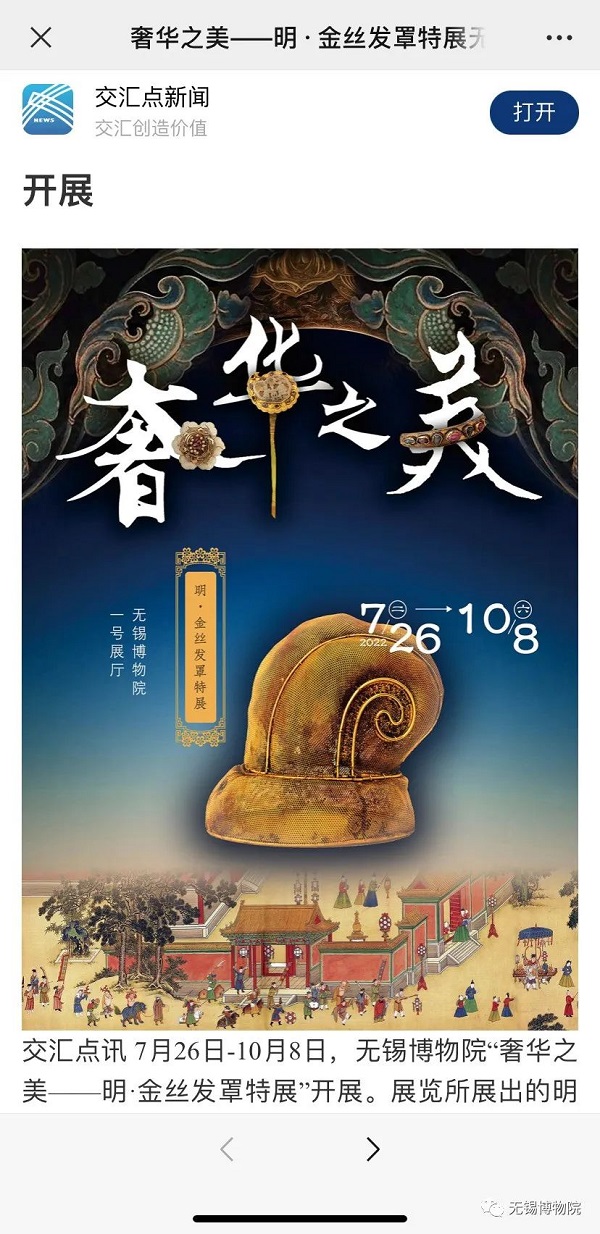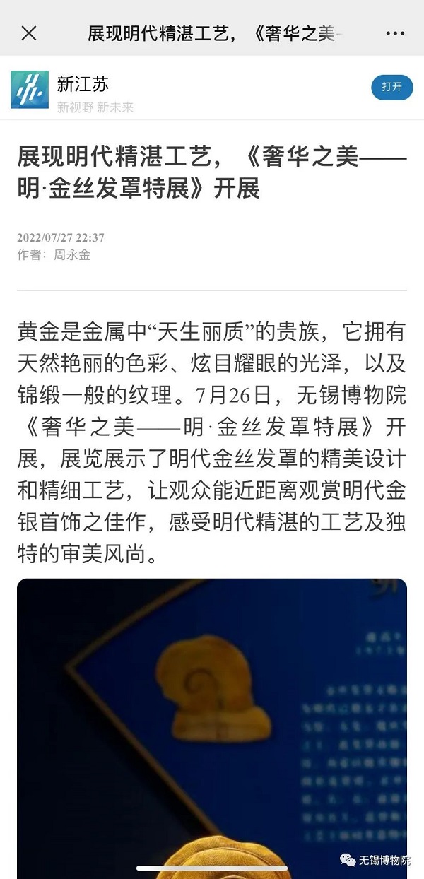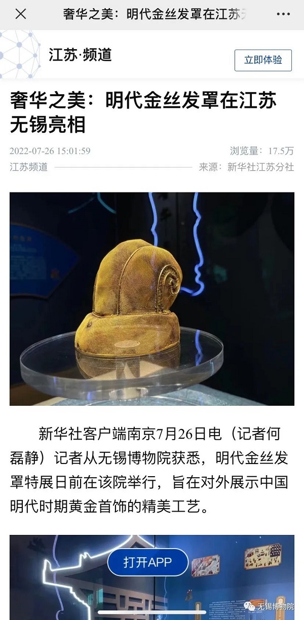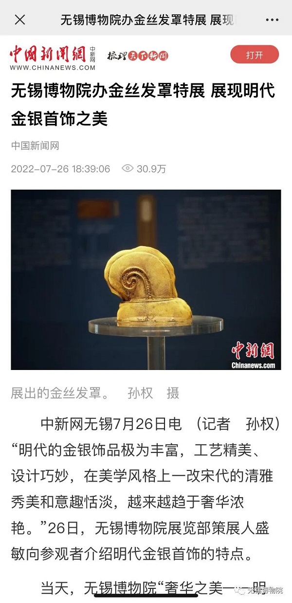 7月26日上午,《奢华之美——明•金丝发罩特展》在无锡博物院1号展厅拉开序幕。展览自开幕以来,引发了广泛的媒体关注。