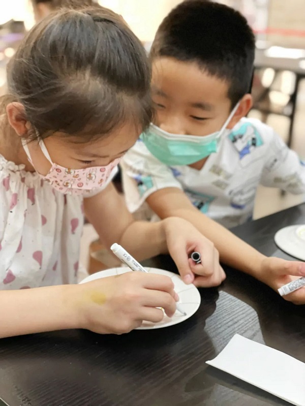 陶瓷的工艺分塑型和上彩,本次课程我们实践的是釉上彩。为了让小朋友更好的掌握彩绘技术,我们选用专业釉上彩水笔,在老师的指导下,有遵循上彩花纹对称的原则进行图案绘制,也有天马行空发挥想象的创作,让生活器具“变身”夏日特定艺术品。