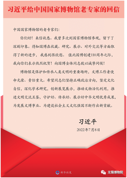 习近平总书记在中国国家博物馆创建110周年之际,给中国国家博物馆老专家回信,充分体现了以习近平同志为核心的党中央对国家博物馆发展、对文博工作的高度重视和对广大文博工作者的亲切关怀,为广大文博工作者奋进新征程、建功新时代提供了根本遵循。