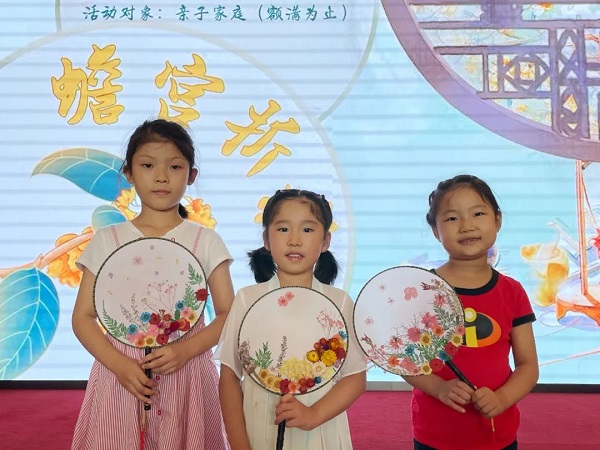 “七宝画团扇,灿烂明月光。”团扇,又称宫扇、纨扇,是一种圆形有柄的扇子,它代表着团圆友善、吉祥如意。在古代,女子到了夏日时节都会持一柄团扇,既可摇动生风,又可用于遮面障羞,拂扫浮尘,驱赶蚊蚋,是须臾不可离手的凉友。而永生花又称为永不凋谢的鲜花,是把鲜花经过脱水、脱色、烘干、染色等一系列复杂工序加工而成的干花,象征着永恒。当永生花遇到古典团扇,又会产生什么样的美呢?9月11日下午,无锡博物院开展了“蟾宫折桂——永生花团扇制作体验活动”。社教老师向大家介绍了团扇的悠久历史和永生花的特点、寓意以及制作技巧,并示范如何摆放和粘贴的手法。孩子们从材料中挑选中意的干花,小心翼翼地放在绢扇上,摆出自己喜欢的图案造型,随后用胶水将花朵固定,拼贴出一面面或清新淡雅,或浓艳绚烂的永生花团扇。执扇轻摇,在清风徐来间感受传统文化,体验古典之美。