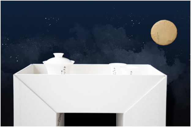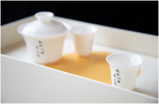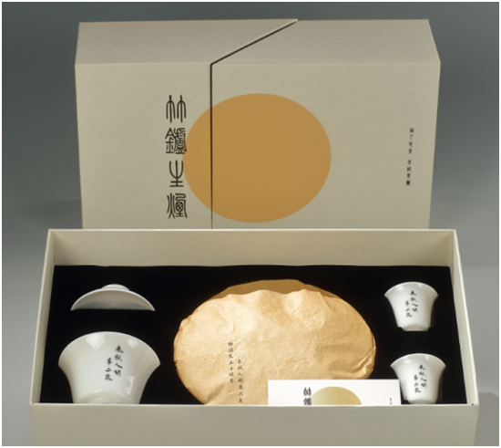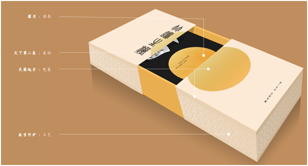 再看内在。选用357克普洱生茶饼 白瓷盖碗1个 白瓷敞口杯一对,黑色绒面衬底,开盒色调对比分明。这款茶饼的选取,创意正来源于“小团月”这一意象。团茶似明月,为此茶饼包装纸颜色特意选用中国传统的“芸黄”色。整体营造出眼中有月,杯中有茶,茶月相融的诗意氛围。同时,清雅的手书小楷“来试人间第二泉”工整印制在白瓷碗身、杯身,显得分外可人。