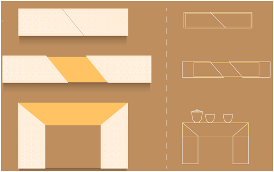 这款“竹炉生烟茶饮套装”,专门提取了“竹炉”外部的纹样,在外包装四周作为底纹装饰。印刷采用UV工艺,暖白和金色两种色调交错,其一自带金色肌理,“玩家”一上手仿佛自带“blingbling”感。封面和腰封选用古雅的小篆字体,在一旁注释“竹下忘言,来试茶烟”。外包装的亮点还不止于此,我们特别设计了分合式样的可拆卸茶台(快来考验你的动手能力吧)。
