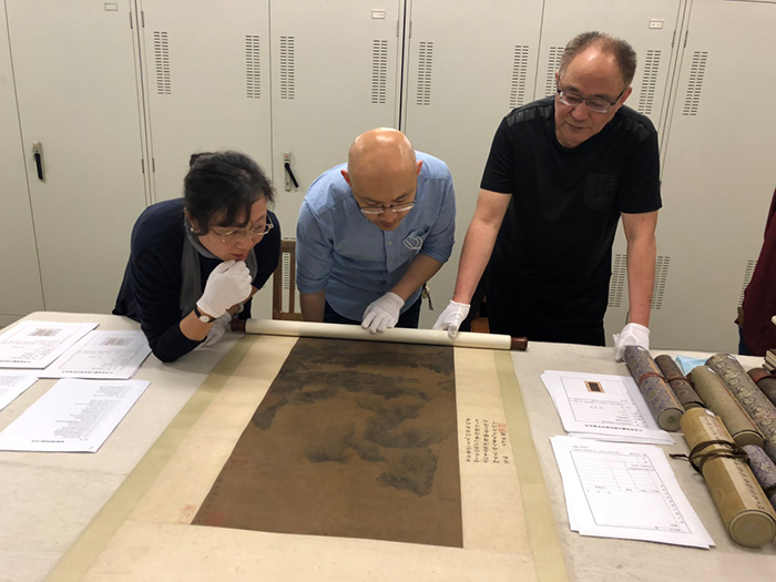 5月24日,江苏省文物局组织相关业内专家,由江苏省文物局博物馆处于新海副处长、无锡市文广新局文化遗产处张鸥副处长带队,携6名专家亲赴无锡,对无锡博物院的书画和织绣类文物进行定级鉴定。书画鉴定组,有持国家出入境鉴定资格的年轻专家庞鸥;有常年工作在文物商店,练就一双火眼金睛的张晓颖;还有熟识锡博院藏的无锡博物院老领导、无锡市收藏家协会会长陈瑞农。织绣类鉴定组,有苏州丝绸博物馆书记王晨,中国唯一国家级云锦工艺美术大师、非遗传承人金文,南博资深鉴定专家杨海涛。