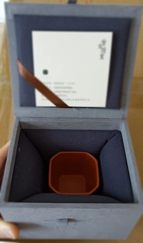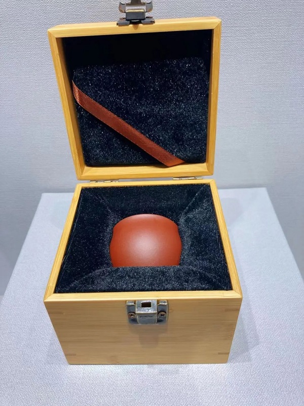 套装选用朱泥大红袍泥料手工仿制小壶,容量约200cc,器型典雅,色泽温润。壶底印刻无锡博物院logo图案。整壶由织锦收纳袋包裹。另配同泥料小口杯两个、25克红茶一罐,组成仿一粒珠紫砂茶具礼盒装。礼盒包装选用深蓝色复合材料,封面正中为扇形花窗,写有书法“来试人间第二泉”。套装内小壶、小口杯均可另配单独的竹编麻布外包装盒。
