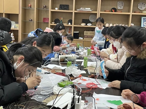 无锡是江南茶文化重镇,以惠山茶会为代表的江南茶事,早已成为极富人文色彩的地域符号。上达帝王将相,下至布衣百姓,各式茶人们在此汲泉煮茗,吟诗作画。当传统茶文化碰撞现代3D打印技术,又会擦出什么样的火花呢?在1月15日的“妙笔生花——文物主题3D打印”活动中,参与活动的27名学生通过参观展览、聆听讲解,学习无锡源远流长的茶文化;通过特色研学课程,探寻古人喝茶的秘密。在深入了解惠山茶文化后,他们拿起手中的3D打印笔,化身“神笔马良”,将自己的创意融入文物之中,创作出与众不同的3D打印作品。
