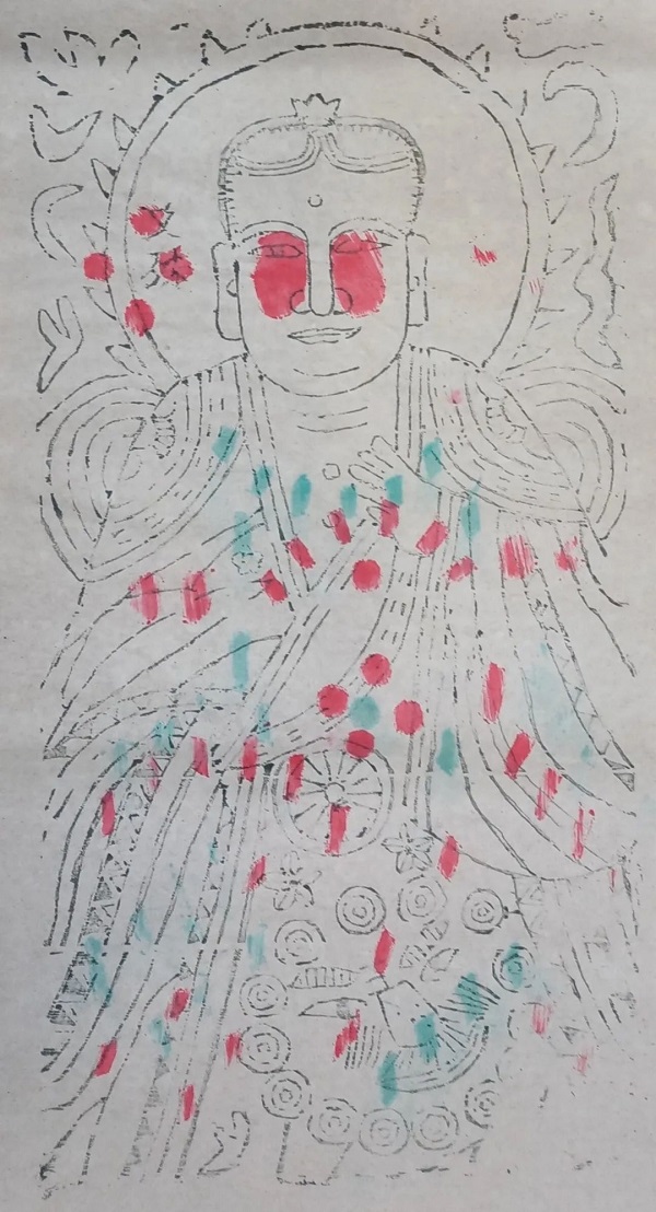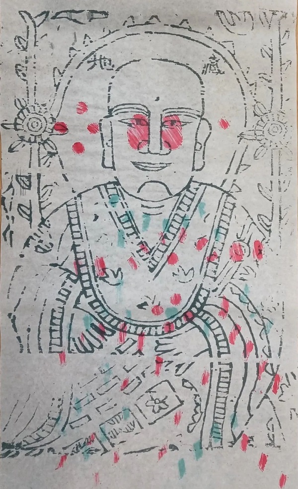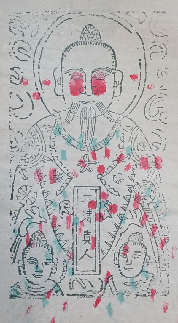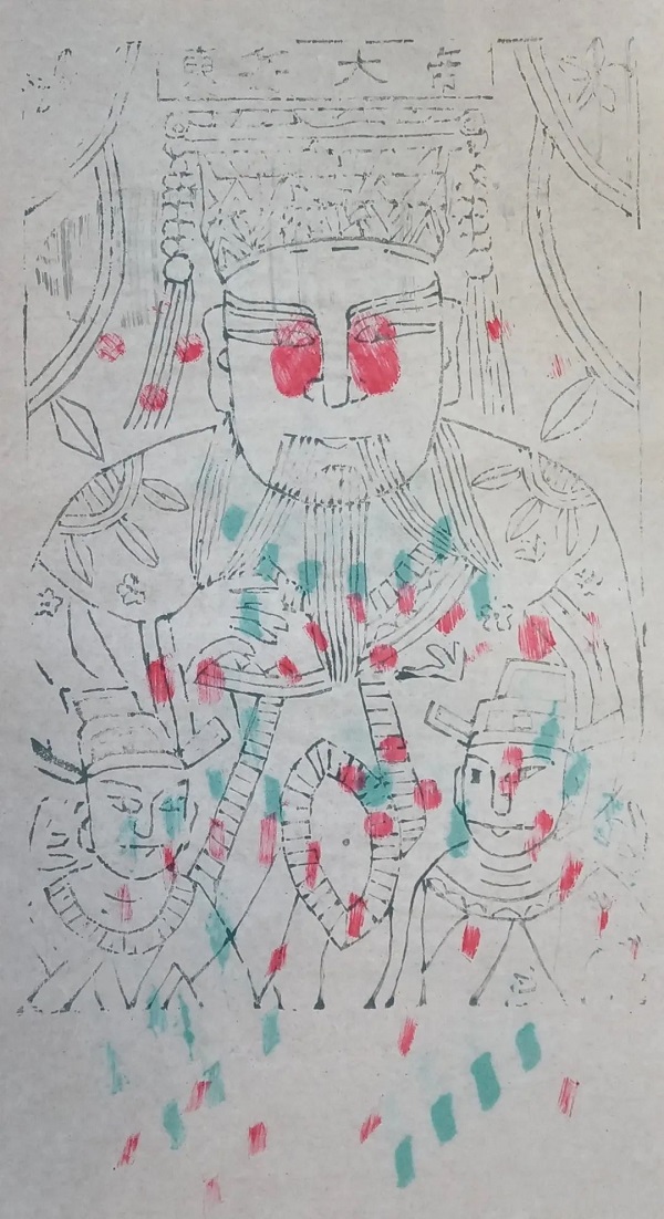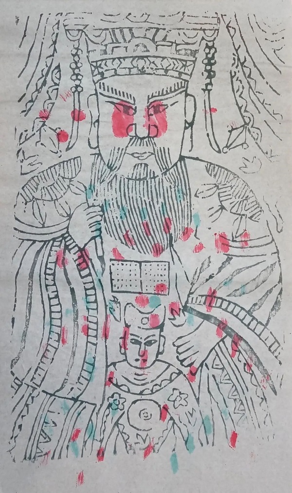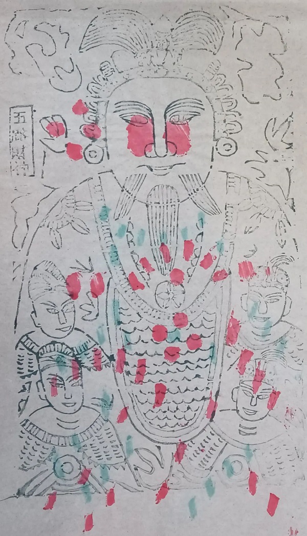 这批捐赠的纸马是由江阴市华士镇村民赵仁献制作的。华士镇曾经有过一批家庭式纸马作坊,赵仁献就是赵氏家庭作坊第三代传人,制作的纸马除供本地乡民使用外,还销往常熟、张家港等地区。江阴华士纸马是使用专用木印板印成的,在单板单色印制后,用一至二块漏板漏印红、绿色点和色块,风格古犷拙朴。纸马里的神祇种类丰富,来自儒释道、历史和传说等。神祇造型写实,着重刻画头部和躯干,让脸成为视觉中心,突出神祇的威严庄重。这些纸马按用途可以分为祀宴、镇宅、念佛、丧葬四大类,每类纸马既有交叉,又有不同。