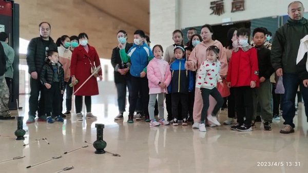 清明时节,草木葱茏,春光烂漫,在这样的阳春四月好时节里,就让我们与古人同游,来无锡博物院体验投壶这一古老的礼仪游戏吧!本次活动结合了“江河辉映”展览中的传统青铜礼器,并以此代壶,在知礼学礼的同时,感受一下传统礼仪游戏的乐趣。活动现场,社教老师向观众介绍了投壶的相关知识,投壶的规则为每次投一支箭,八支箭为一局。看似简单,其实技巧很难把握,蓄力点和投掷方向都需要进行多次的尝试与调整,大家兴致高昂,在反复尝试中玩得不亦乐乎。就让我们通过这种沉浸式体验使民间游戏得以传承,让其所蕴含的人文精神重新回归到我们的生活之中吧!