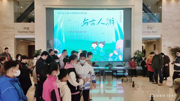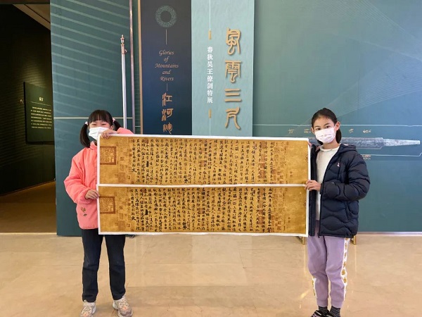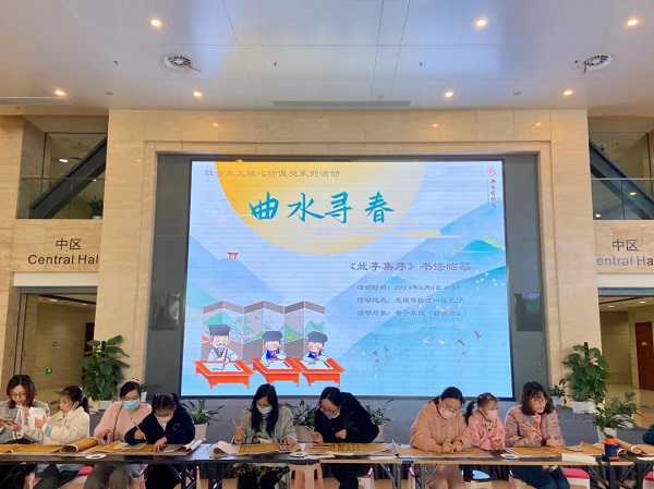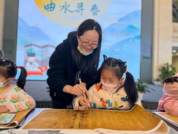 在春光明媚的清明假期里,无锡博物院举办了“曲水寻春——《兰亭序卷》书法临摹”活动。在活动中,社教老师们首先为大家介绍古人上巳游春的习俗,讲述了兰亭雅集的故事,让大家了解古代文士间“以文会友”的优秀传统,一窥他们的风雅生活。在老师的指导下,现场的小书法家们十分投入,凝精聚神地临摹着王羲之的《兰亭集序》。“石如飞白木如籀,写竹还应八法通。若也有人能会此,须知书画本来同。”孩子们在一笔一画的临帖中,感受行书字体优美的线条和提按顿挫的笔法,在书法艺术中体验古人上已游春的闲情雅趣。