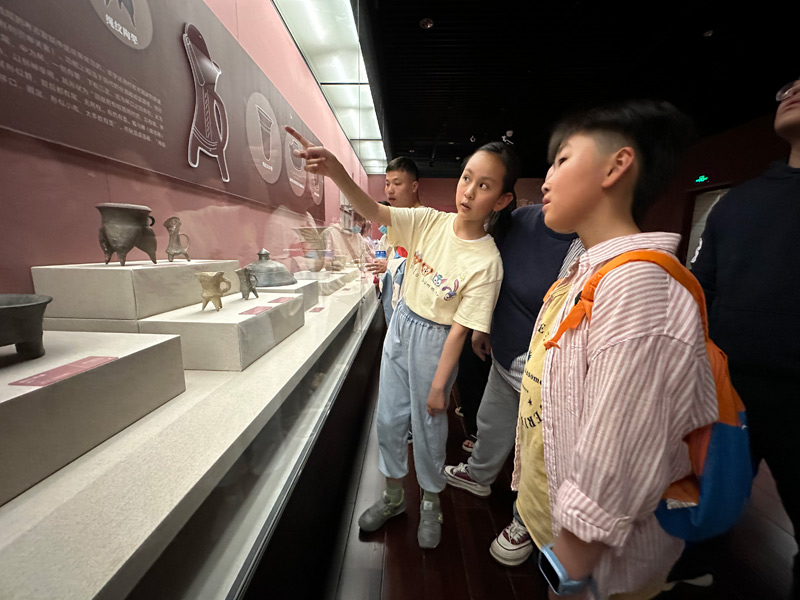 志愿者周志萍,在展厅遇到了一对河南来的父女俩,看着家乡来的青铜重器,听着志愿者的讲解,小姑娘禁不住心驰神往,跟父亲说,回去后,一定要去当地博物馆,好好看看!