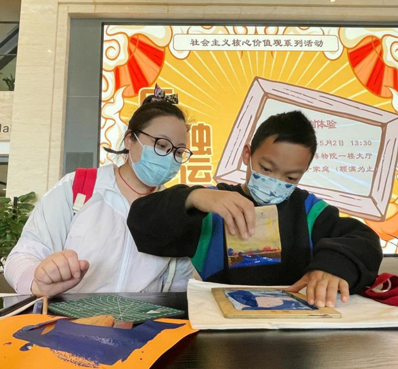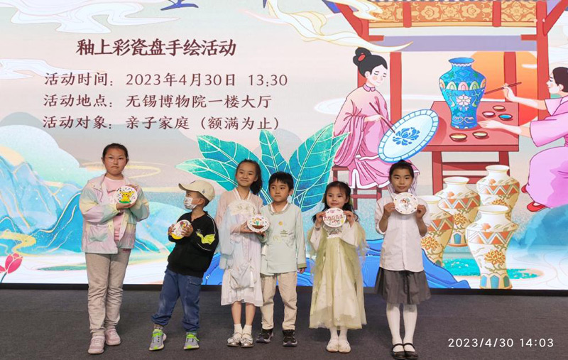 4月30日上午,无锡博物院于一楼大厅开展了“瓷土生辉——釉上彩瓷盘手绘”活动。参与活动的小朋友在家长和社教老师的帮助下,在空白瓷盘上抒发天马行空的想象,绘制出自己喜欢的图案,在动手体验中领略陶瓷之美。
