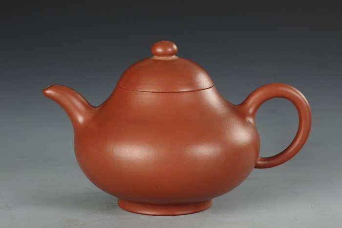 无锡博物院所藏顾景舟制梨形朱泥壶即顾氏仿古阶段的作品。该壶通长16.5,腹宽10.8,口径5.5厘米,高10.5厘米,由朱泥制作而成,通体光素,胎体致密轻薄,朱色呈色纯正,通体观之,全壶光洁柔滑,浑然天成,体现出作者精湛的制壶技艺。