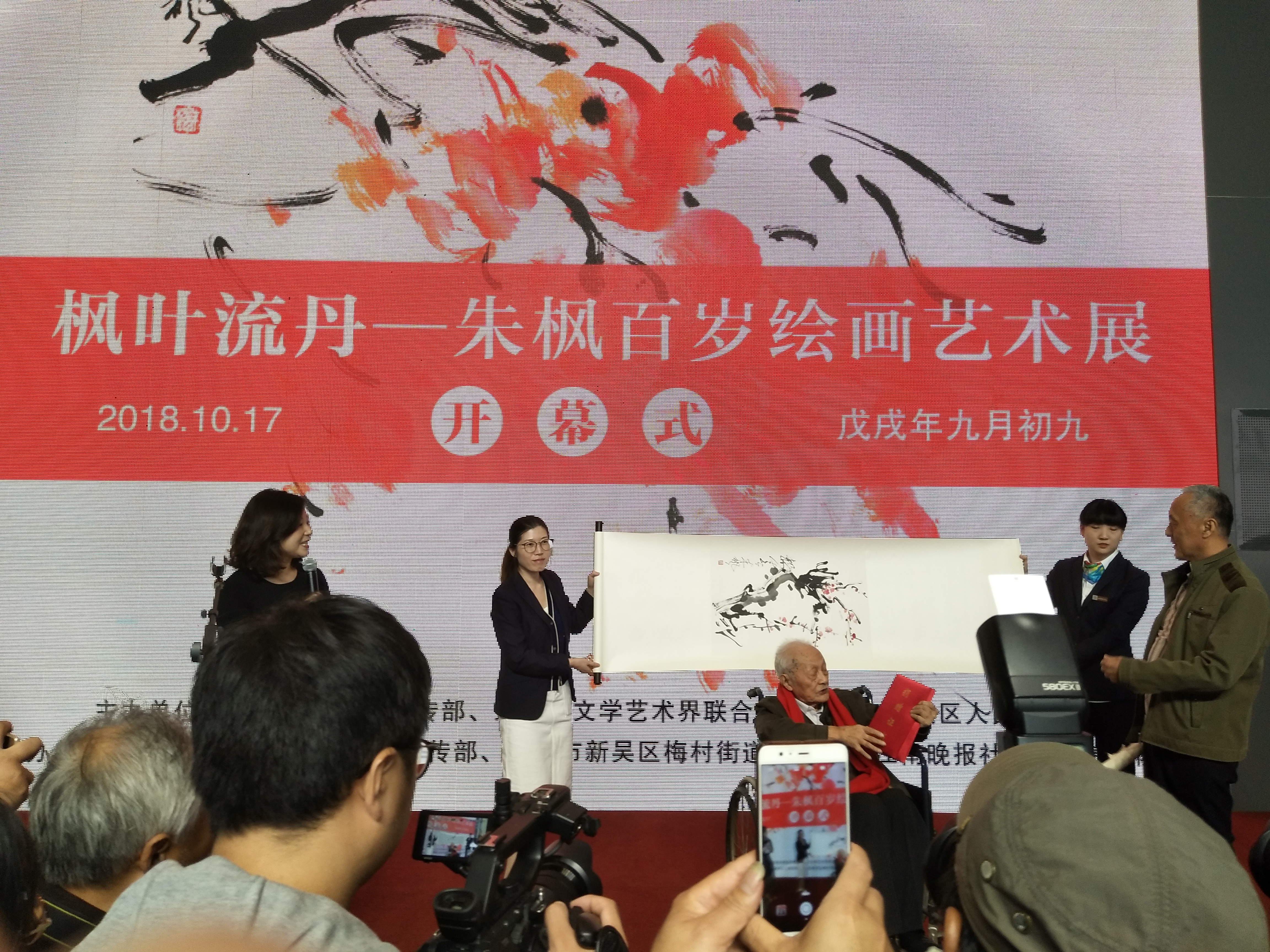 10月17日,适值重阳佳节,由中共无锡市委宣传部、无锡市文联、无锡市新吴区人民政府主办,无锡高新区(新吴区)宣传部、无锡市新吴区梅村街道、江南晚报社、无锡博物院承办的“枫叶流丹——朱枫百岁绘画艺术展”在无锡博物院隆重开幕。
