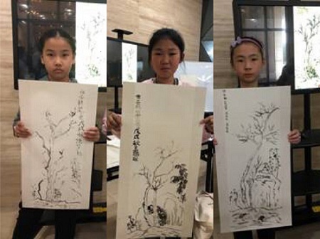 活动中,无锡博物院特聘老师凌洁带领大家参观了《梁溪折桂——无锡博物院开放十周年展览》,详细讲述了《苔痕树影图》的历史背景、人物事迹,并就笔墨技法加以剖析与示范,指导学生完成了自己的《苔痕树影图》。