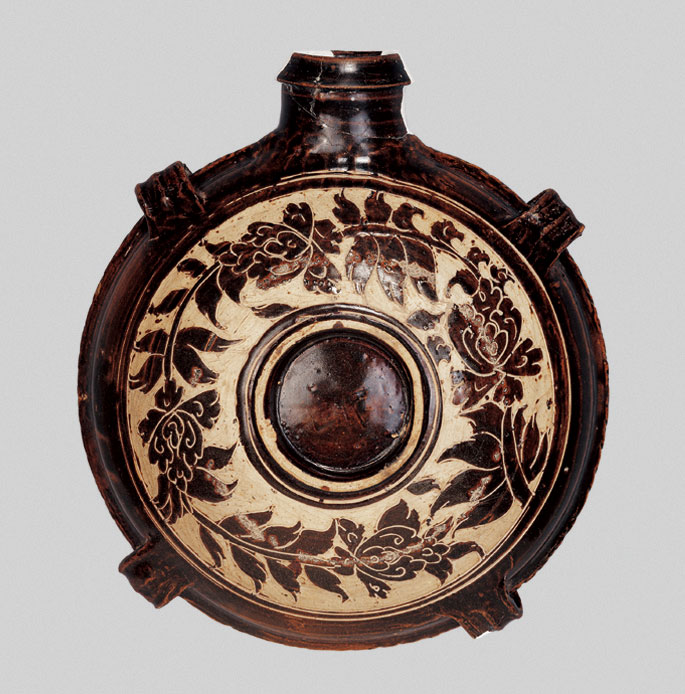 黑釉剔刻牡丹花四系扁壶