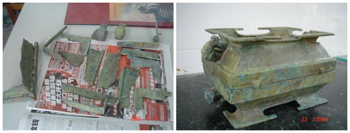 战国青铜簠(修复前) 战国青铜簠(修复后)