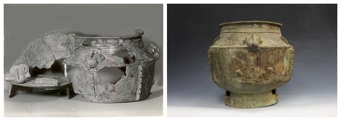 商代青铜罍(修复前) 商代青铜罍(修复后)