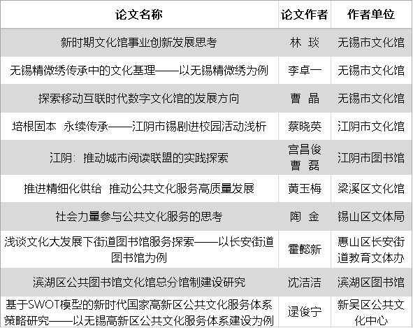 此次论文评选共有来自苏州、无锡、常州、南通四地的42篇论文在征文活动中脱颖而出,主题涵盖了全民艺术普及、志愿服务、非遗保护、精细化供给、总分馆、数字文化馆建设等公共文化体系建设的重要命题。不少论文取材新颖,视角独特,深刻犀利,对目前现代文化馆建设过程中存在的不少问题都予以了认真梳理,深入探讨。