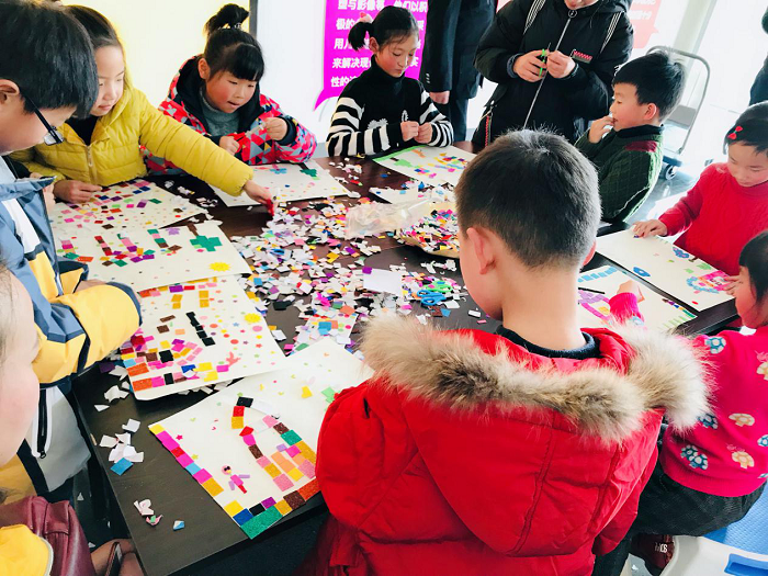 动手环节小朋友们用所给的丰富材料通过“色块”的拼接完成马赛克贴画作品,打破了少儿绘画的传统方式,将绘画与手工结合在一起,不仅培养了小朋友们对色彩、色块的感觉,还极大地发挥了他们的想象力,学到了区别于课堂的有趣知识。