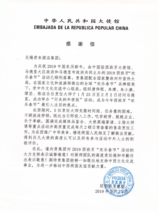 2月13日江南晚报报道的《无锡大厨“行走的年夜饭”情动马德里》 一文有了后续。据悉,中国驻西班牙使馆向无锡君来酒店集团发来了感谢信。