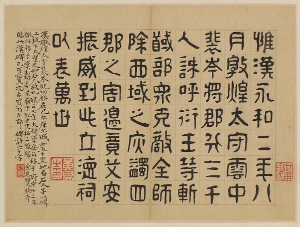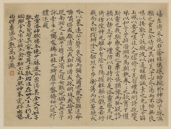 值得一提的是,展览中黄易的书画合册共八开,其中绘画五开,书法三开。第一开绘丛林图,细笔点染,全用石青色,右边三行隶书律诗;第二开仿明末清初“画中九友”的邵弥,竹木之中有一小亭,亭中两人对坐而谈,笔墨清秀,画风醇厚;第三开墨笔山水;第四开乃是仿明人董其昌设色山水画;第五开设色绘制垂柳桃花图;第六开为黄易手抄汉碑《裴岑碑》;第七开为黄氏题识;第八开为黄易手抄楷书《洛神赋》,字体工整隽秀,一派“帖学”家数。