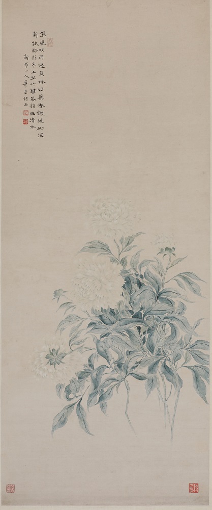 第二部分的“丹青逸格”,选取自元以来的明清绘画十五件,囊括了山水、花鸟以及人物,其中尤以“清初四僧”和“扬州画派”的作品居多。而第三部分的“文人词臣”板块一共展出十二件书画作品。所展书画多为明清时期的文人官宦为主,主要有倪元璐、陈洪绶、王澍、王士祯、袁枚、嵇璜、梁同书、王文治、严绳孙、郑文焯以及张照。这些展品主要以对联为主,偶有几本册页和立轴,其中明末的倪元璐,书法水平极高,他与黄道周、王铎二人鼎足而立,并称“明末书坛三株树”,又与王铎、傅山、黄道周、张瑞图并称“晚明五大家”,成为明末书风的代表。清人严绳孙的书法入晋唐之室,绘画则人物、花鸟无所不能,此《临梅道人山水图扇面》为临仿元代大画家吴镇之作,笔墨浑厚。而倪氏《松石图》为倪氏少见的意笔松石图,以水墨生晕,具苍润古雅之致,展示了这位书家在绘画方面的才能。