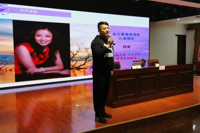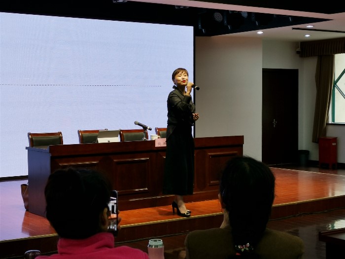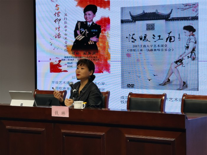 钱琳老师是土生土长的无锡人,也是《无锡是个好地方》的首唱。可以说,江南的美与韵味已深深的融入了钱琳老师的血液之中。在讲座中,钱琳老师以“江南”为切入点,从“何谓江南”、“何为流行歌曲”、“当江南和流行结合——演唱方法探索”三个方面,并通过实例分析、现场示范,深入浅出地为学员讲解了如何用不同的方式和角度去理解歌曲、诠释歌曲。