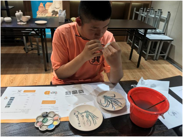 素胚画兰写兰的体验环节,同学们将自己心仪的咏兰诗词和优雅的兰花手绘在尚未施釉的素胚瓷盘上,融入了自己对诗词意境的理解。独一无二的手绘精美瓷盘在同学们的手中诞生。
