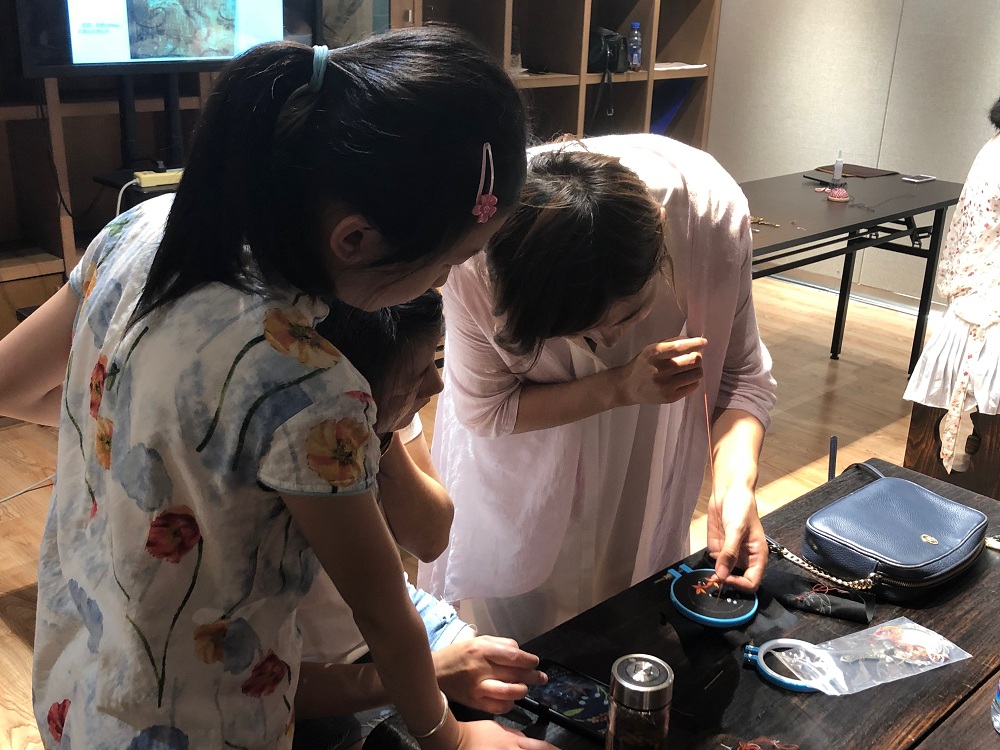 本次活动,我们结合博物馆馆藏杨芝田《绢本花卉图册》,取图册中的花、叶,采用针绣的方式,古画新作,重新给予其活力。课程中,贾老师先为大家讲解了刺绣的起源和历史,以及精微绣的发展创新。在了解了理论知识之后,同学们开始上手操作。在丝线刺绣的课程中,同学们先学习劈丝,将丝线一分为六,取出其中一股,再按照老师画的绣样缝制。老师们教授了滚针以勾勒花茎,套针来填充叶片。大家全神贯注,一针一针仔细勾勒,最终都在老师们的指导下完成了镜子。