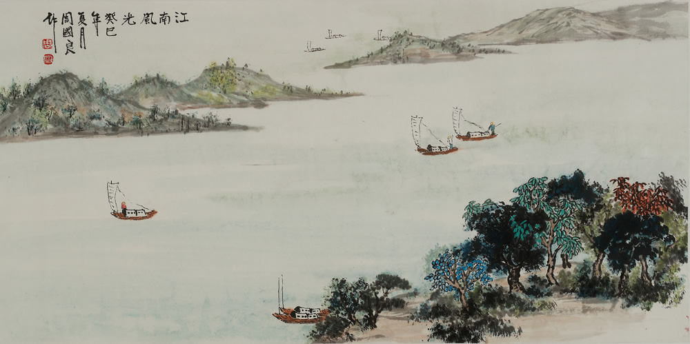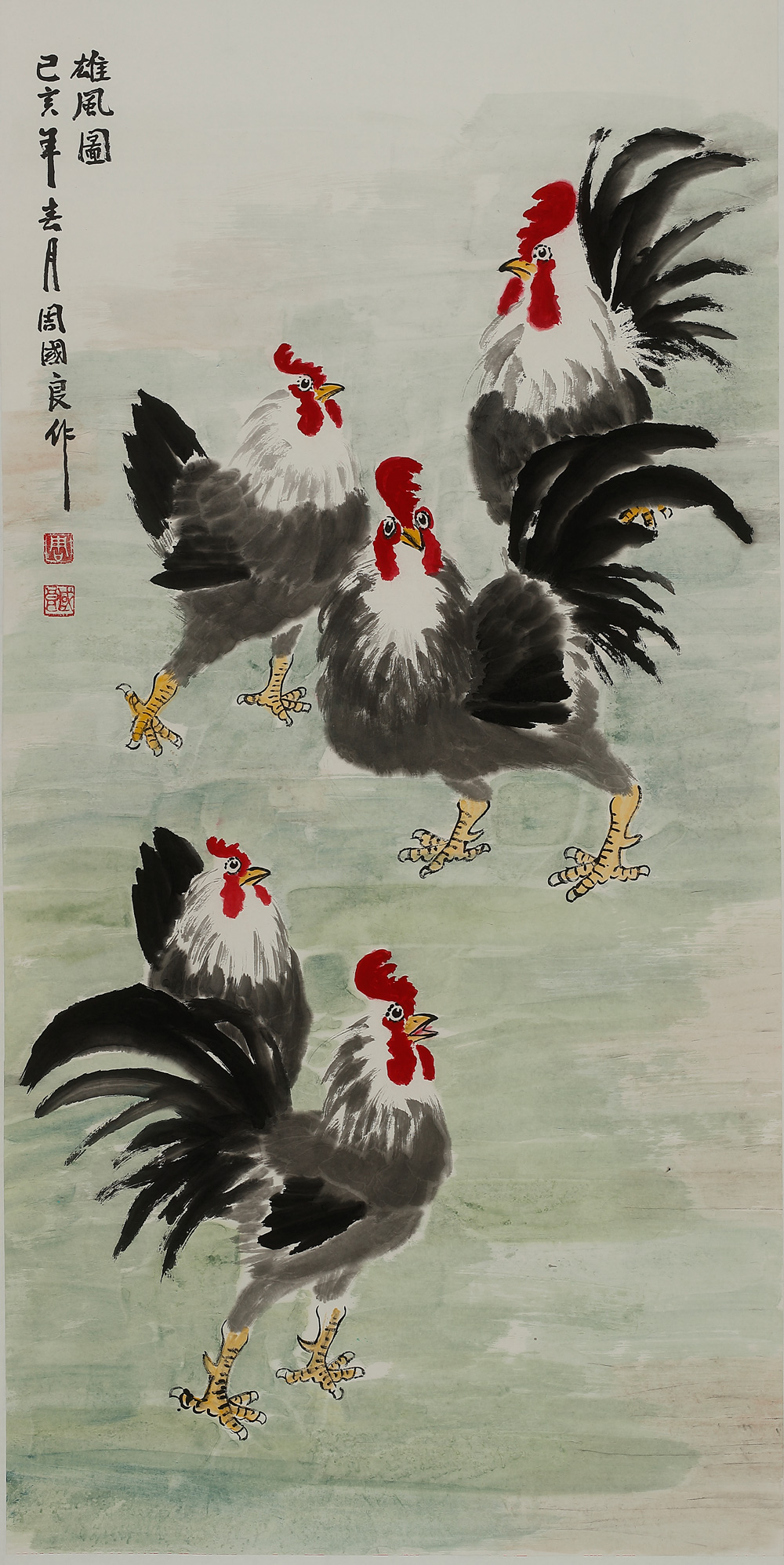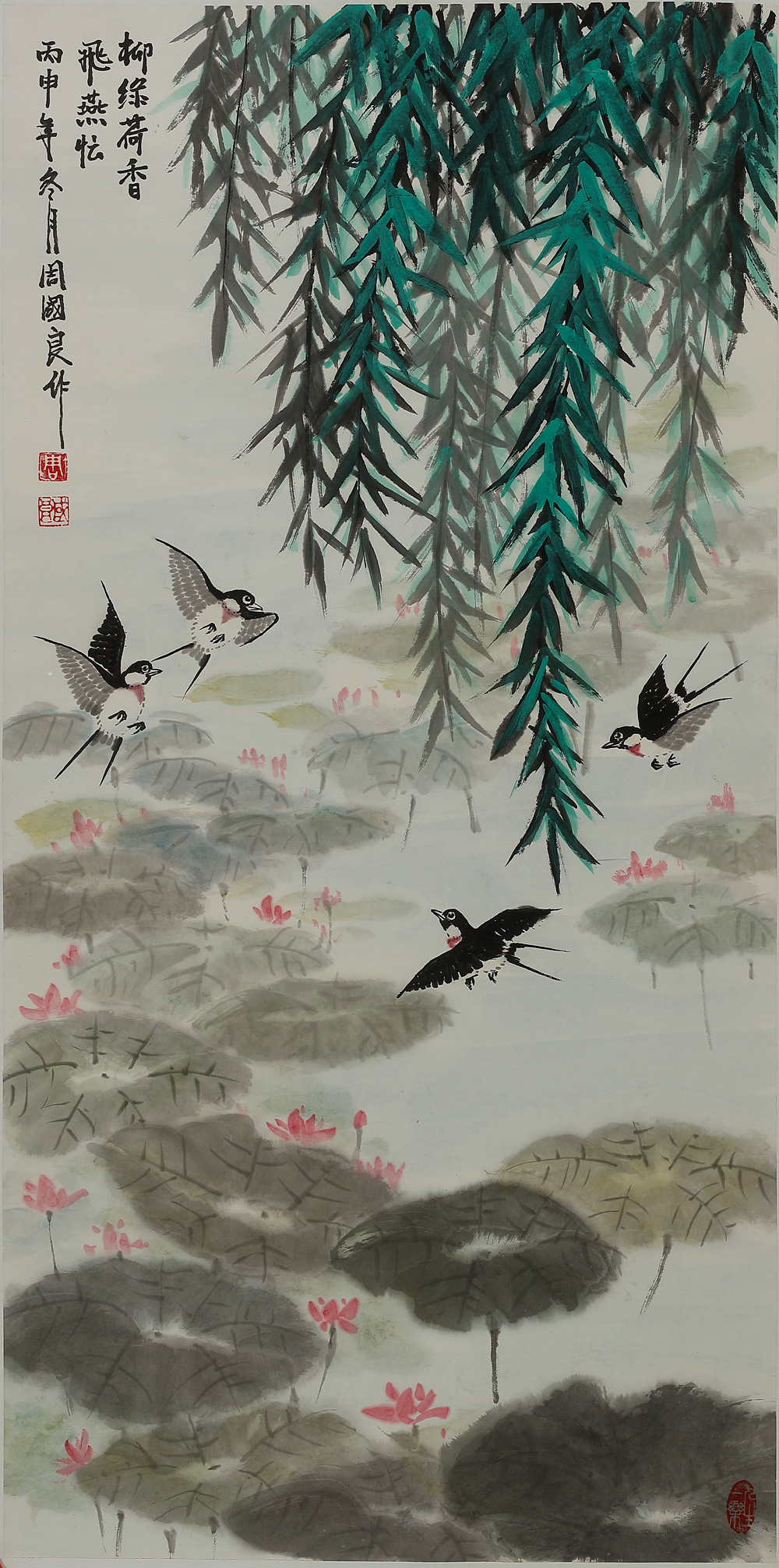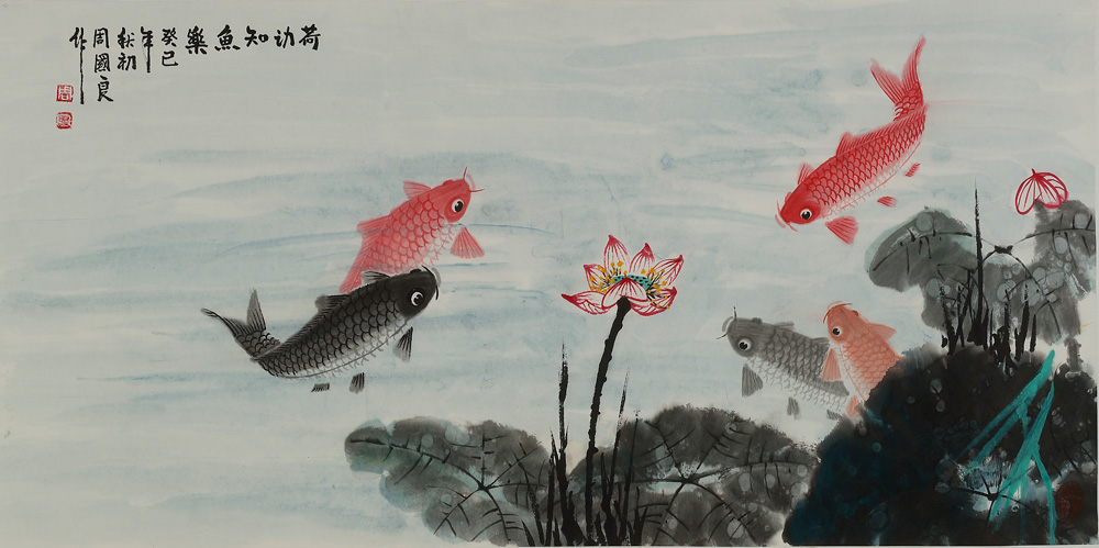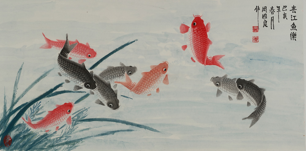 七十年代初,周国良师承海派著名画家吴青霞研习鲤鱼、花鸟。吴青霞是位全能型的画家,所画鲤鱼尤为出色,生机勃勃,情趣无限,人称“鲤鱼吴”,在书画界有着极高的声誉。同乡名士钱名山赞:“才慧天生信有之,闺中下笔虎头痴。常州星象苍凉甚,数到青霞女画师。”周国良拜于吴青霞名下后,画艺大进,他的金鲤介于工笔与写意之间,一条条鲜蹦活跳的鱼跃然纸上,相互嬉戏、形态各异又不失和谐凝重,气势优美,独标一格。周国良成为画鱼新秀,为海内外所称道。