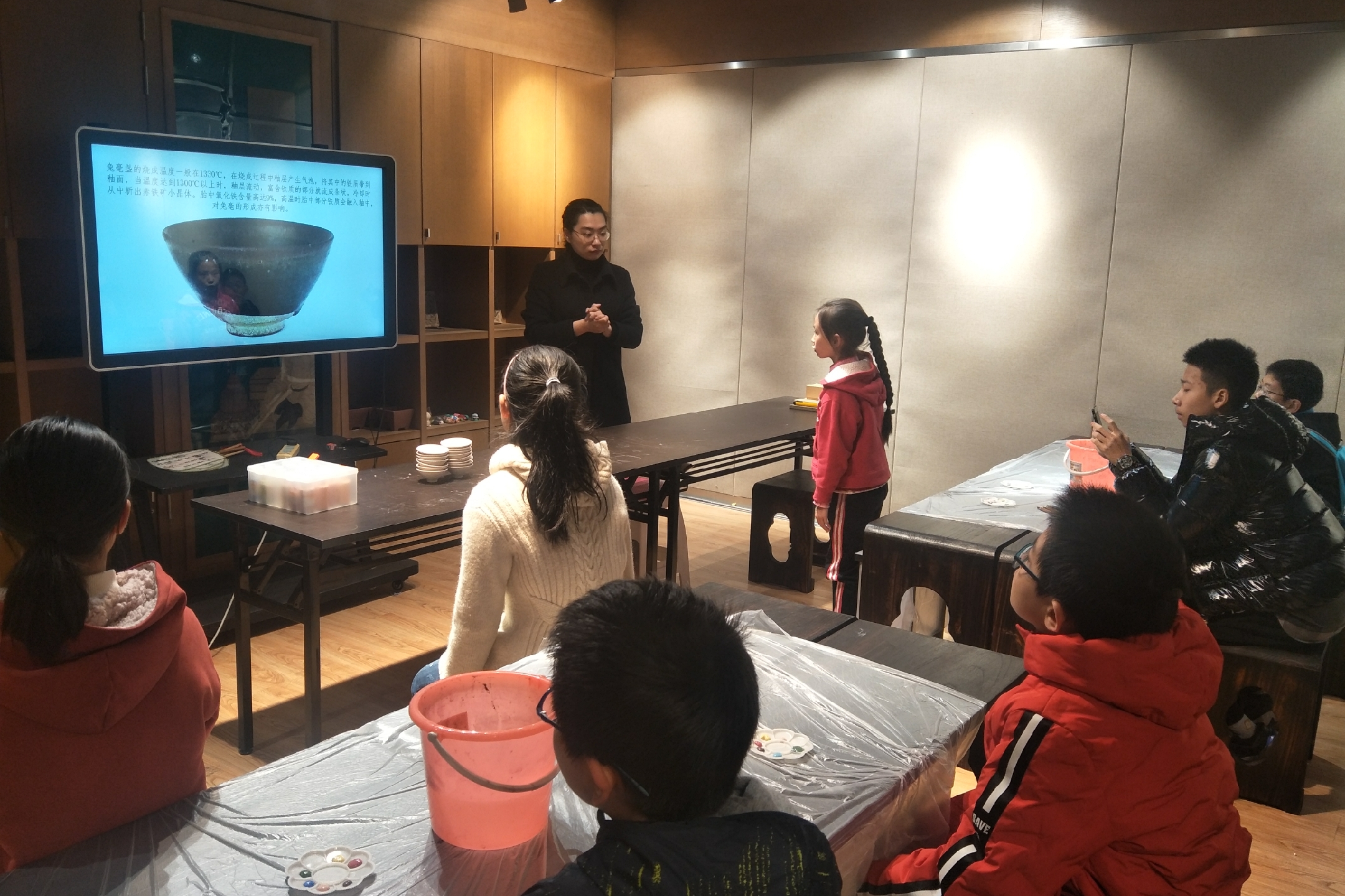 12月14日,无锡博物院文博课堂开展了“松风鸣雪兔毫霜——建窑精品瓷器赏鉴”活动。本次课堂老师从南方著名窑址建窑所产的兔毫盏入手,让同学们了解建窑茶盏的发展历程及其代表性瓷器兔毫盏的独特制作工艺。课程设计由浅入深,针对小学生的知识储备与学习能力,以实物参观开启课堂调动了学生的上课兴趣,期间配以视频与实践操作加深了学生对建窑的认识,深化了课堂效果。通过学习,同学们对黑釉碗为什么是布满细长铁锈色条状纹的、怎么会形成犹如兔毛的纹理都有了一定的了解。活动最后,同学们在老师的指导下,结合自己在展厅见到的兔毫盏实物,用釉下彩颜料绘制出了属于自己的创意茶盏。