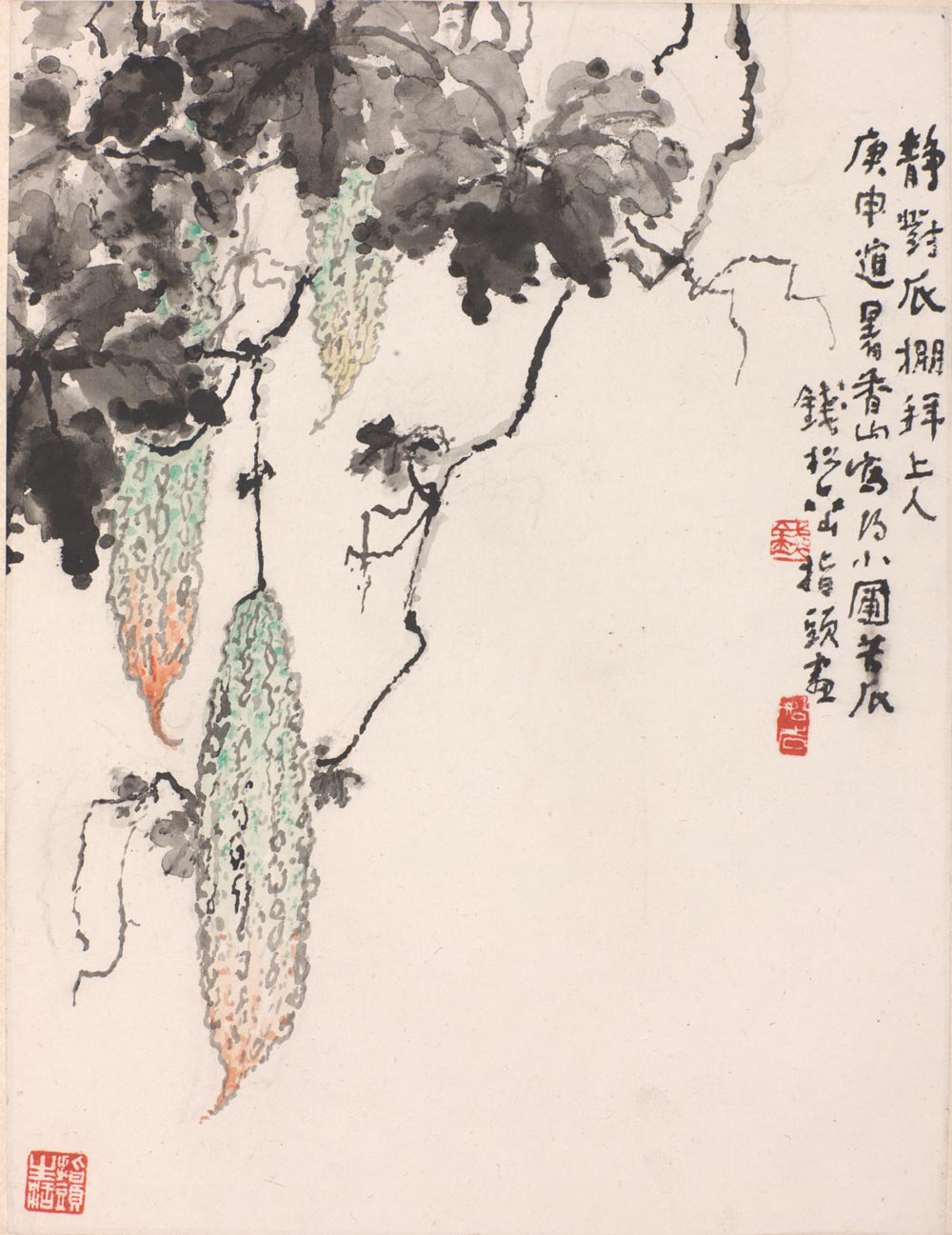 钱松喦在幼年时期就开始学仿指画,后直至年逾八旬,重拾儿时对指画的尝试。此作以苦瓜入画,以表明钱老向“苦瓜上人”石涛的致意,间接地也表明其重归早年澹雅的心迹。图中瓜叶以水墨写意法为主,三只苦瓜用双勾法写出,间以藤蔓串插,画面上水墨淋漓的瓜叶,配上青翠欲滴的苦瓜,为一幅贴近生活惹人喜爱的绘画佳作。