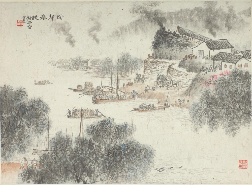 此作真实再现了宜兴家乡制陶工业的场面,画作采用近实远虚的手法,远景笔墨含蓄,树木疏散概括,隐现的几顶屋脊于浩茫烟云之间;近景笔墨丰富,勾画细密严谨,描绘码头船只装载、运输陶缸的繁忙劳作场景。