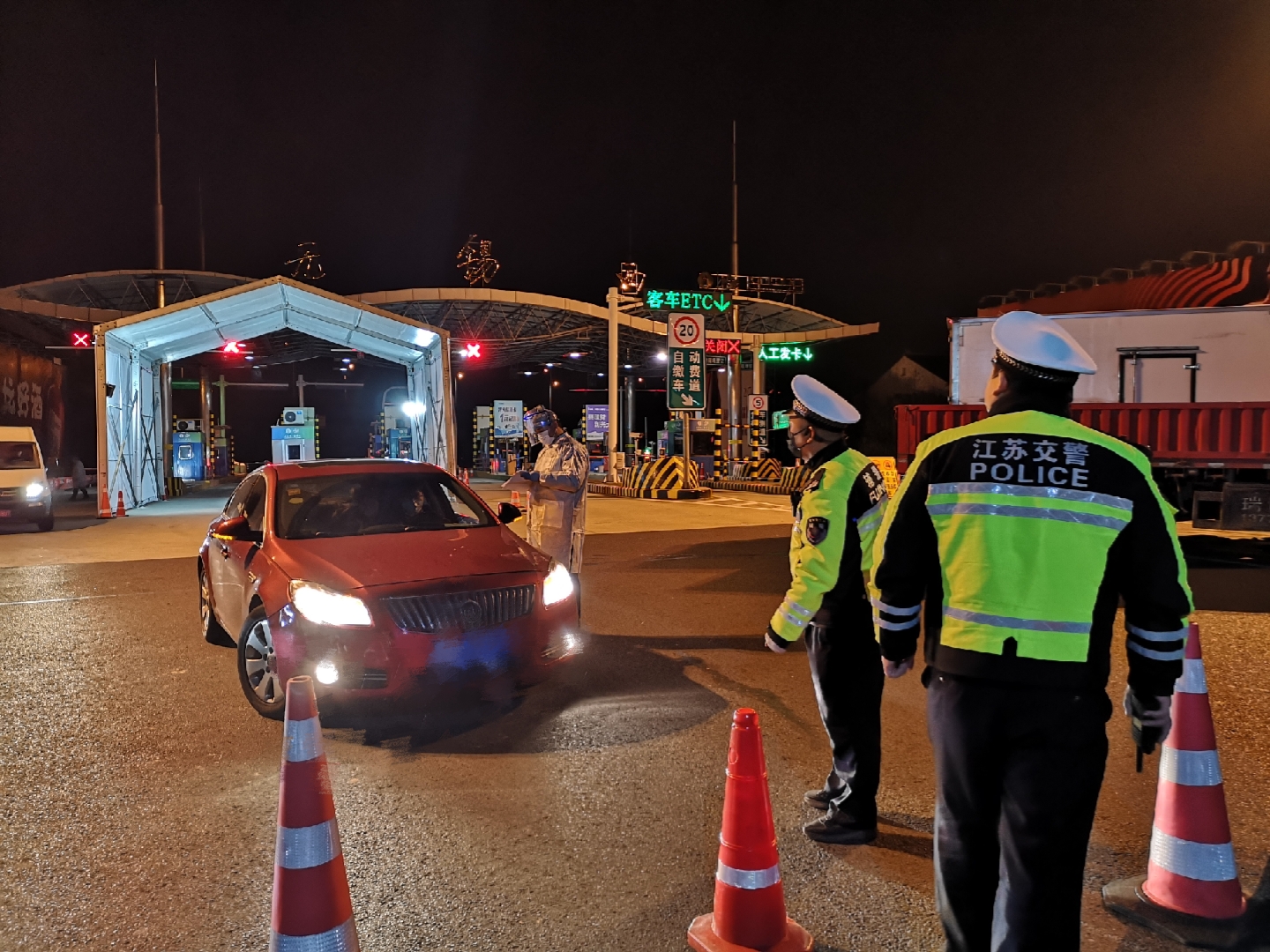 每天有大量车辆、人员由无锡西高速道口进入无锡,这里是无锡“外防输入”的重要关口之一。我们两位先锋队员和来自公安交警、医疗卫生、城管路政以及街道的工作人员一起坚守岗位,对进入无锡的车辆人员进行身份核查、体温检测及登记备案。