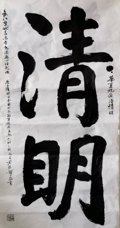 庚子(2020)清明日是一个特殊的日子,当天10时整,防空警报鸣响,汽车、火车、船舰鸣笛,人们静立垂手,对抗击新冠肺炎疫情斗争牺牲烈士和逝世同胞表示深切哀悼。著名书法家刘铁平先生通过笔墨纸砚缅怀抗疫英烈,抒发抗疫情怀,他将自己创作的三幅抗疫主题书法作品捐赠给无锡博物院。