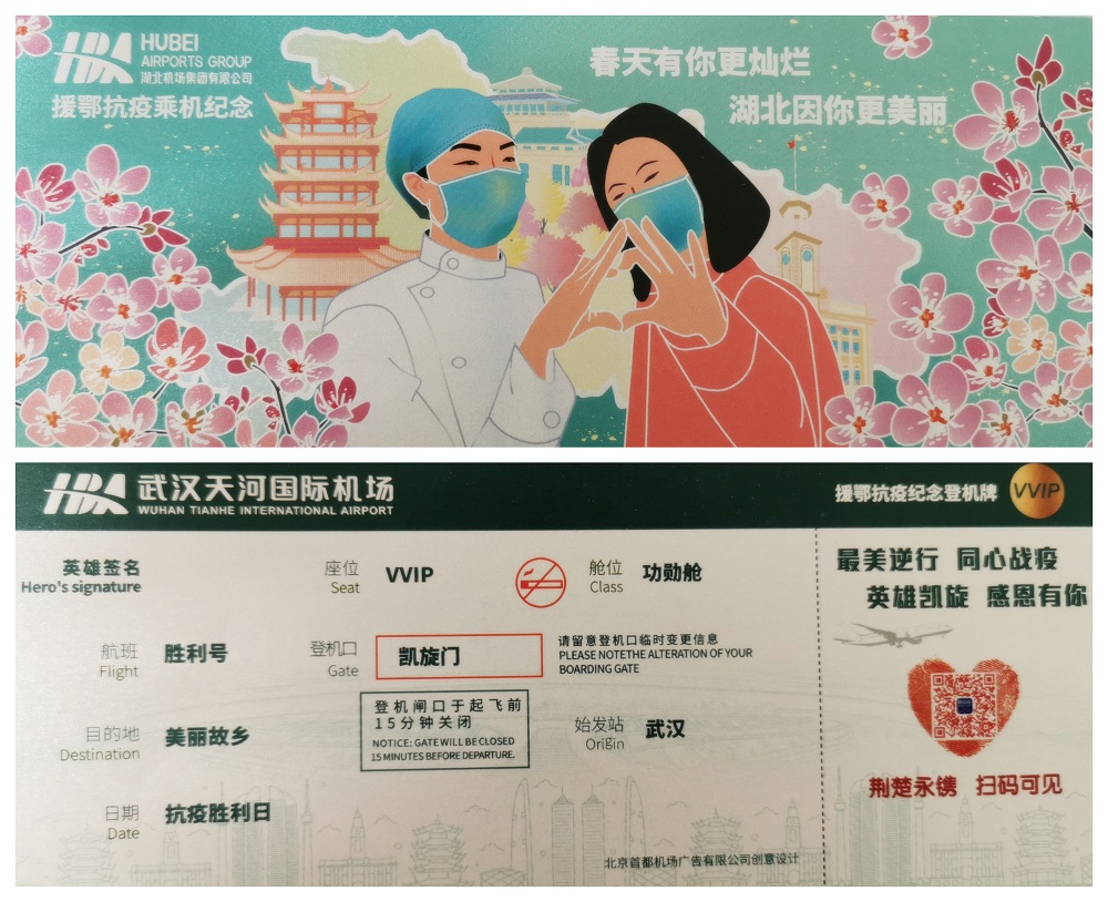 援鄂抗疫纪念登机牌是武汉天河国际机场为各地援鄂医疗队队员们精心准备的“限量版”纪念登机牌,设定援鄂医疗队员在“抗疫胜利日”,从“凯旋门”登机口登机,乘坐“胜利号”航班,进入“功勋机舱”,返航“美丽故乡”,表达了广大人民群众对医疗队的感激之情。
