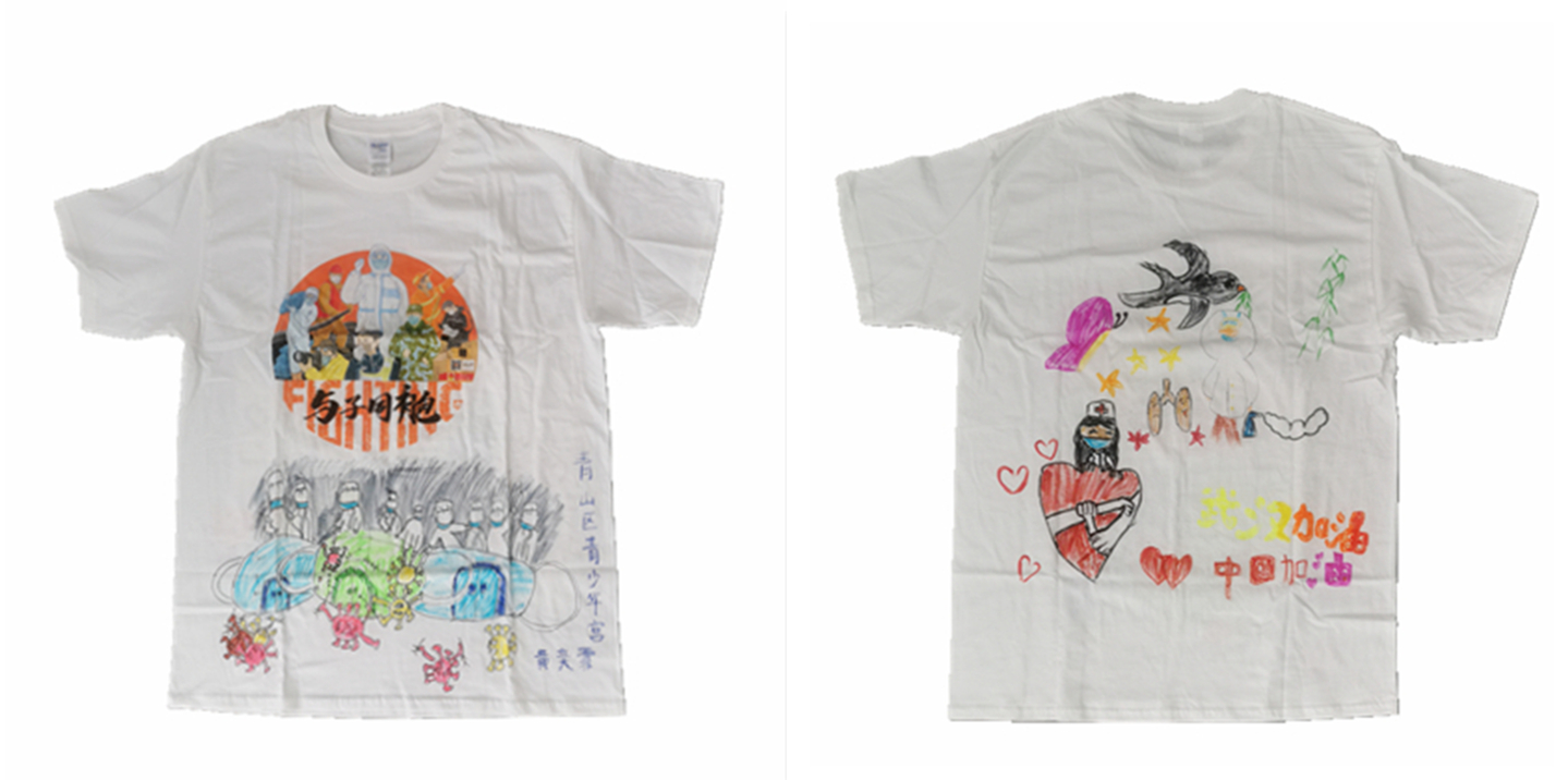 手绘文化衫正面印有专门设计的“与子同袍”的字样和医护等战“疫”一线人物群像图案,下方和背面画满了武汉青山区青少年宫小朋友的涂鸦作品,小朋友用画笔为白衣战士祝福。