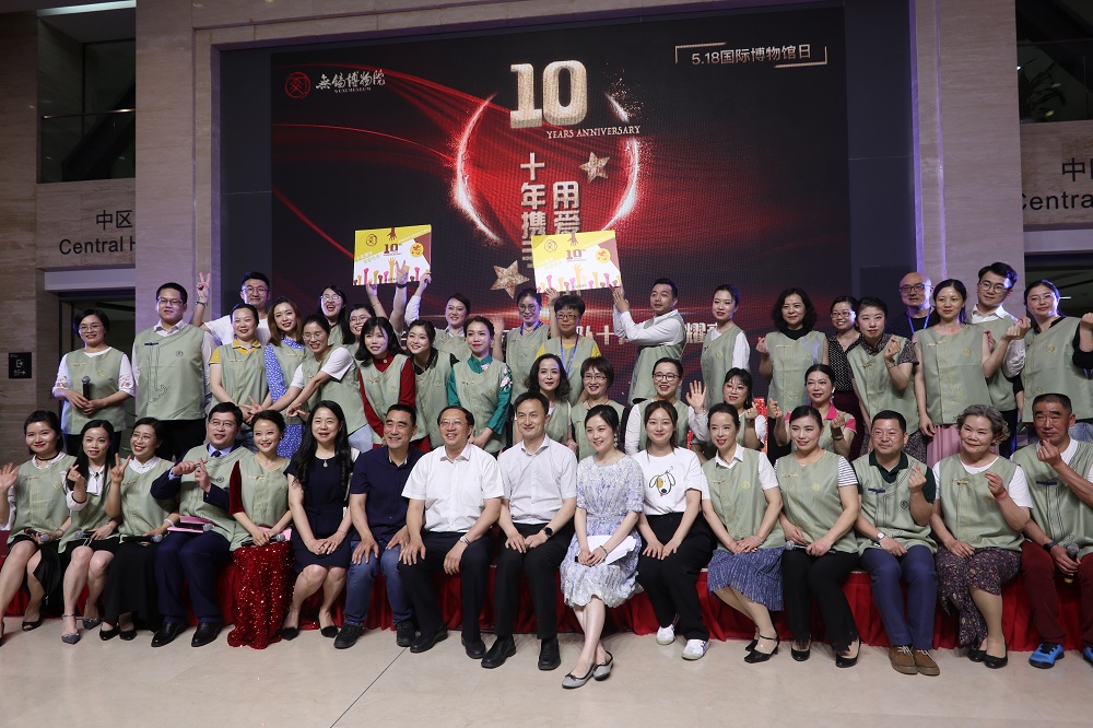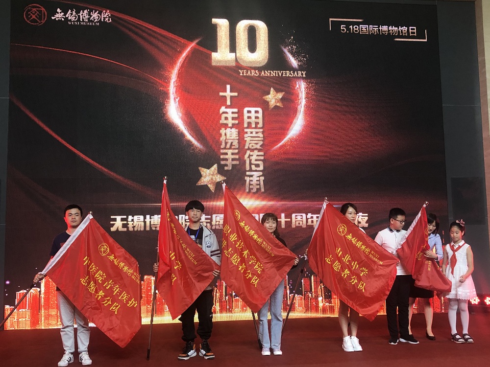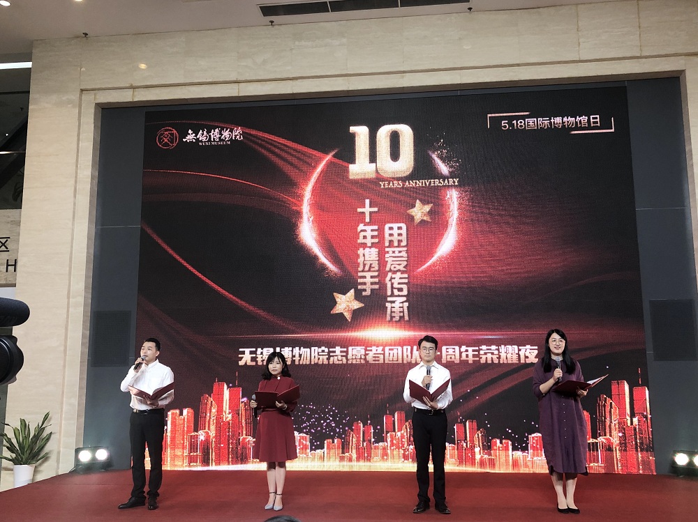 夜幕降临,璀璨星火装点着城市,晚上6:30,无锡博物院内灯光绚烂,观众有序入场。“十年携手用爱传承”——无锡博物院志愿者团队十周年荣耀晚会闪亮开场,年度志愿者颁奖、志愿者授旗、新款制服发布、新志愿者招募仪式,配以视频短片、舞蹈、诗朗诵,可爱的锡博志愿者们向观众款款走来,我们共同感受着属于他们的荣耀。2019年无锡博物院志愿者获得“中国博物馆十佳志愿者团队”称号,这项国家级的荣誉来自于锡博志愿者团队完善的管理制度和平日扎实的工作。我们期待属于锡博志愿者的下一个精彩十年!整场晚会梁溪之声现场直播,17850人通过网络观看了这场荣耀夜。