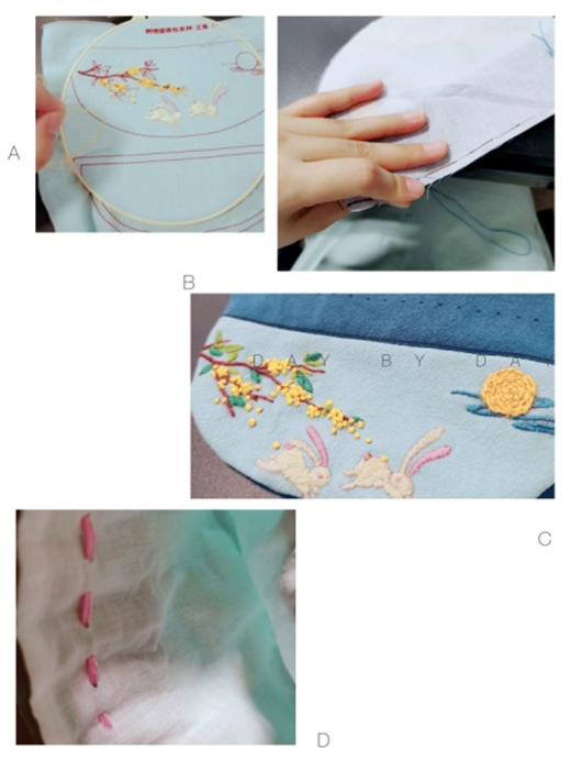简单的流程就是,先绣花(兔子、仙鹤、云朵、月亮不同绣法)再将绣好的布片缝制成香囊。刺绣考验着每一个家庭成员的细心和耐心。