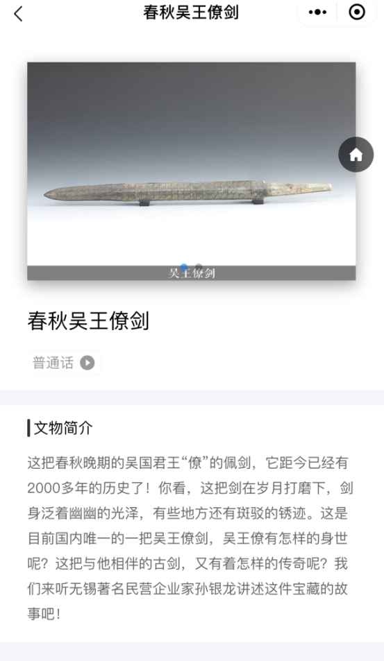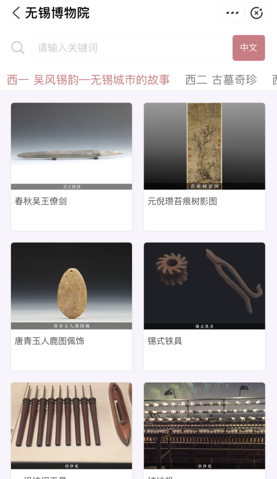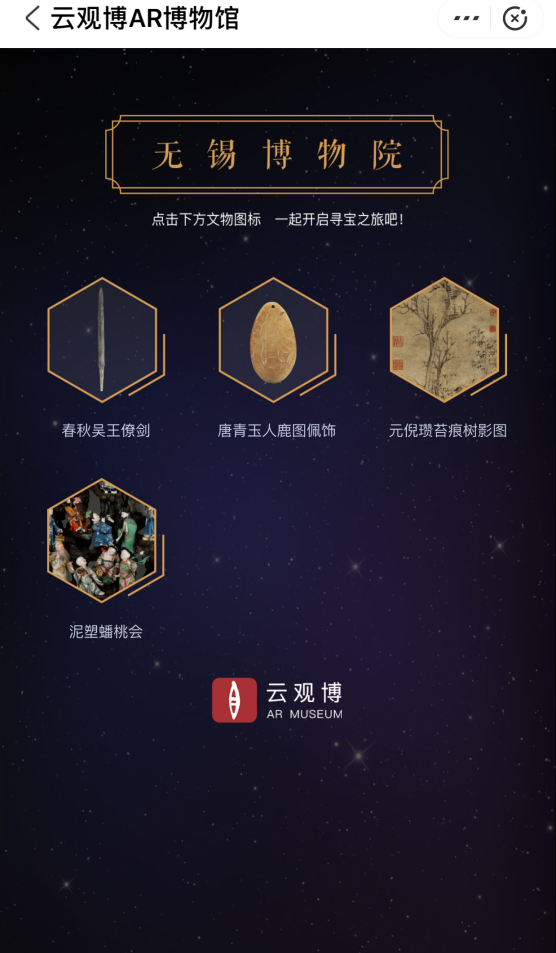 云观博平台的锡博导览在无锡博物院官方微信和支付宝都可以进行浏览,重点向观众呈现无锡博物馆常设展览中的精品文物。观众在官方微信点开“我的锡博”栏目即可选择“云观博”进入浏览。支付宝平台需要在支付宝APP主页搜索“云观博”,进入平台后搜索无锡博物院即可浏览;还可以在支付宝APP主页搜索“云观博AR博物馆”,无锡博物院有“春秋吴王僚剑”、“唐青玉人鹿图佩饰”等四件藏品上线,带来不一样的观展体验!