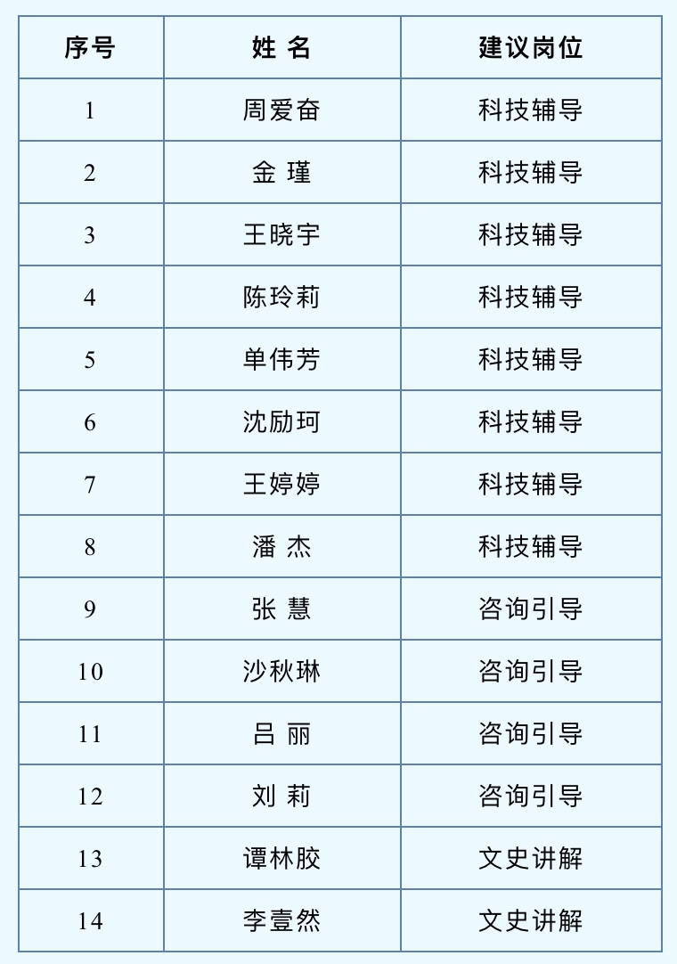 经过7月、8月志愿者培训课程到9月份志愿者考核,2020年无锡博物院新招募志愿者们过关斩将,最后顺利晋级!志愿者试用期名单如下: