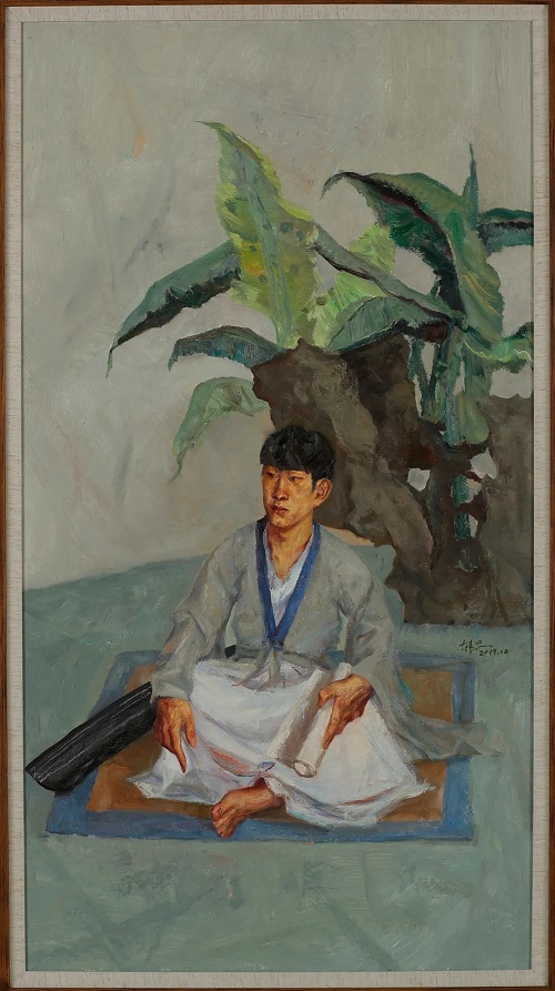 作者:韩晶,毕业于江南大学设计学院,油画创作与理论研究方向,艺术学硕士学位。江苏省美术家协会会员、无锡市美术家协会会员、无锡青年美协理事、无锡书画院特聘画家。现为无锡太湖学院艺术学院教师、国际商业美术设计师B级。此次创作灵感来源于无锡博物院藏文徵明为士人琴师杨季静所绘鸣琴肖像,画面大胆保留了原画的基本构图,人物置于恬淡清远的青灰色调之中,左手执书,古琴在侧,年轻人着汉服若有所思,画面气氛宁静致远,暗示当下年轻人读书思考,回归传统文化的源流。